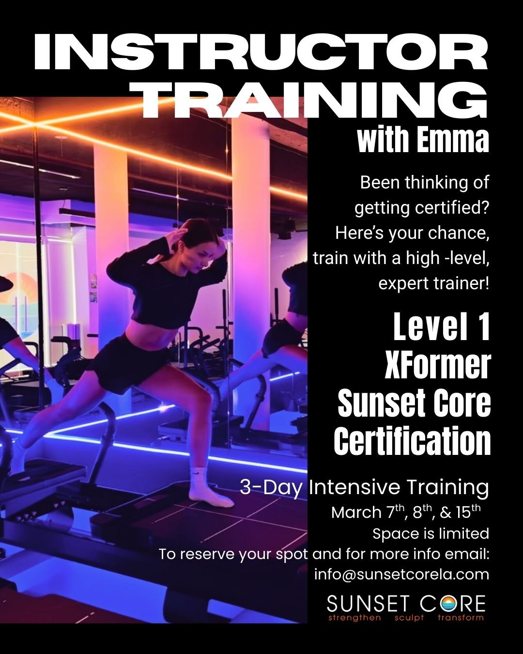 This course will be held by our wonderful lead instructor, Emma, who has been working as an expert trainer for several years. She has spearheaded training programs both here in LA and in Arizona, where she helped her mother establish her own highly successful XFormer Studio. She will teach you the fundamentals of the exercise as well as help you learn to cue and transition clients through an entire workout. This is your chance to train with an expert! Emma brings the knowledge, the skills, and the spark - sharing everything you need to step confidently into teaching. Expect to be challenged, supported, and pushed past your comfort zone as you level up into your strongest self!